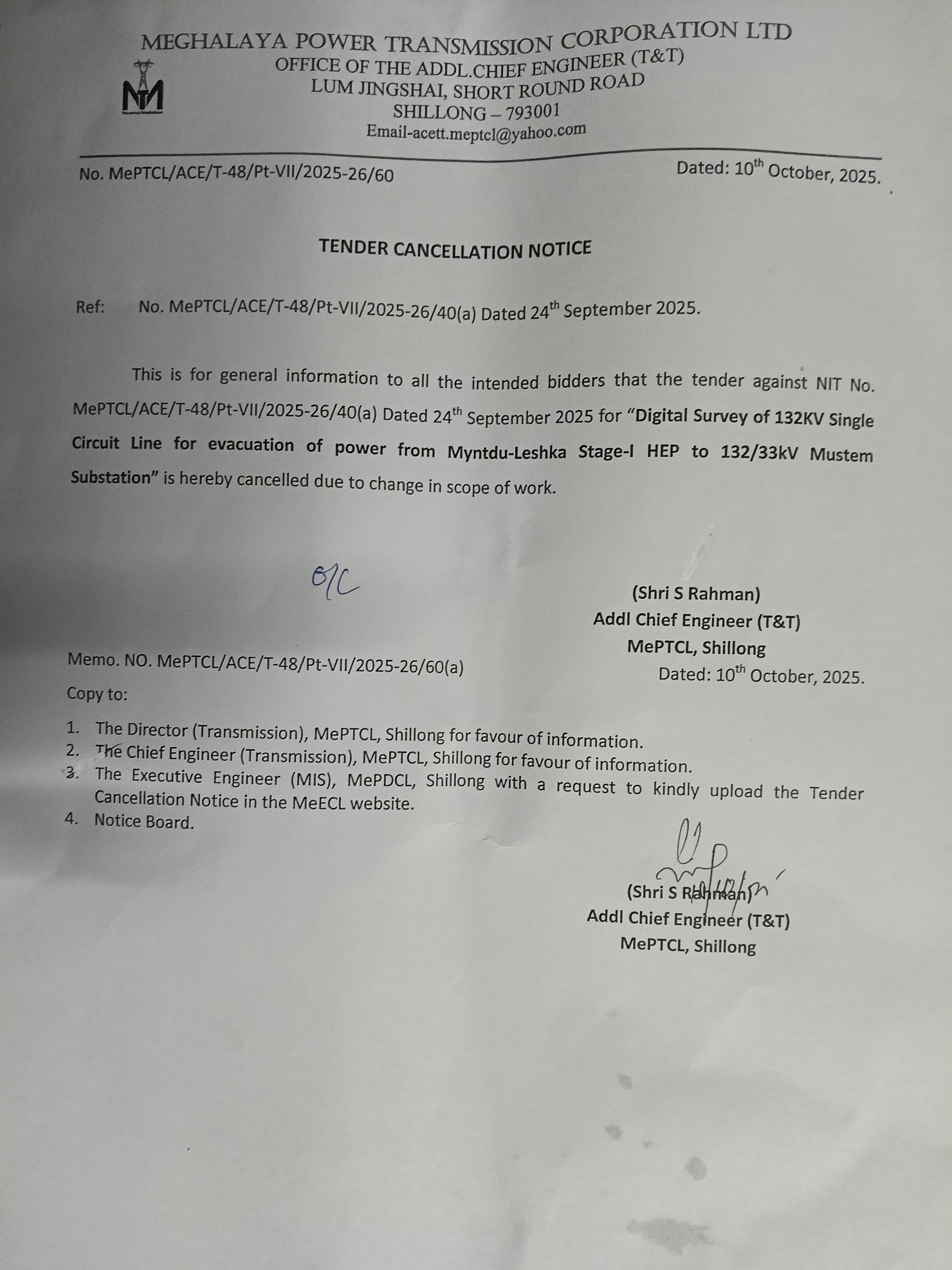 Notice: Cancellation of tender for the work “Digital survey of 132KV Single Circuit line for evacuation of power from Myntdu-Leshka Stage-I HEP to 132/33KV Mustem Substation” by Editor_1 | Oct 11, 2025 | News Loading... Taking too long? Reload document | Open in new tab View | Download [486.30 KB]